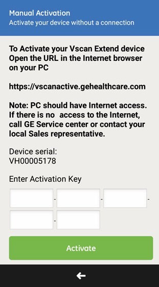 1. Enter the activation key generated while registering on the portal (https://vscanactive.gehealthcare.com)