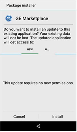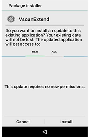 The Software Update allows to update Vscan Extend firmware, GE Marketplace, GE Kiosk, and Vscan Extend application through the internet. New versions of these software applications can be downloaded from GE Server. You can choose either install or cancel the update.